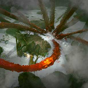 Once a vast ocean world, underwent a drastic transformation about 1,000 years ago when a nearby planet’s gravity evaporated its water and shattered its moon. Now, ice orbits the atmosphere, and gravitational anomalies distort its terrain. The planet's flora consists of aquatic plants adapted for land, mixed with species brought by colonists, while the hostile fauna, though sparse in predators, are cunning and dangerous. Rogax is also ravaged by radioactive storms and gravity shifts that create deadly ice falls or lift objects into the air.